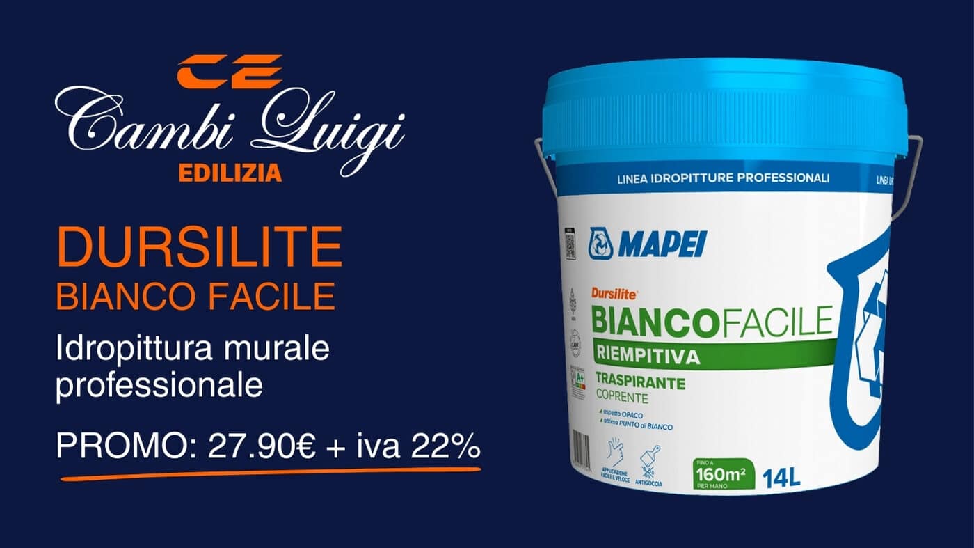 Dursilite Bianco Facile è un’idropittura murale professionale per interni, ideale per applicazioni rapide e risultati uniformi. Buona copertura, ottima traspirabilità e finitura opaca per superfici nuove o già verniciate. Promo…